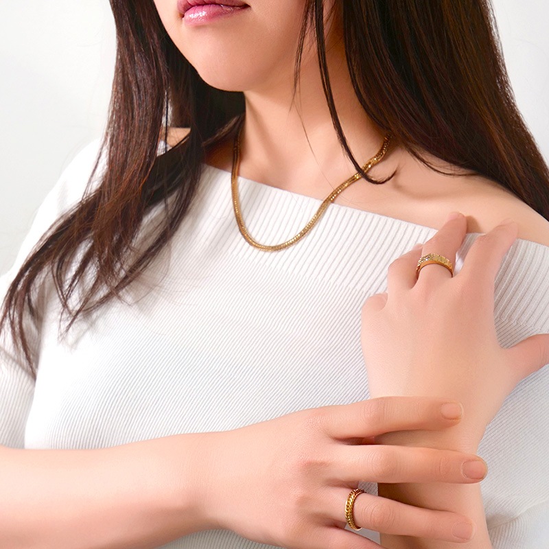 白のトップスにゴールドジュエリーを身につけ、華麗な印象に。存在感のある12面トリプルの喜平ネックレスは、美しい煌めきが目を惹き、デコルテを明るく綺麗に見せます。手元にはどの角度からでも煌めきを放つ喜平リングに、しっかりとした地金にダイヤが施されたリング。主役級のリングにする事で、全体的にバランスの良いコーデです。
