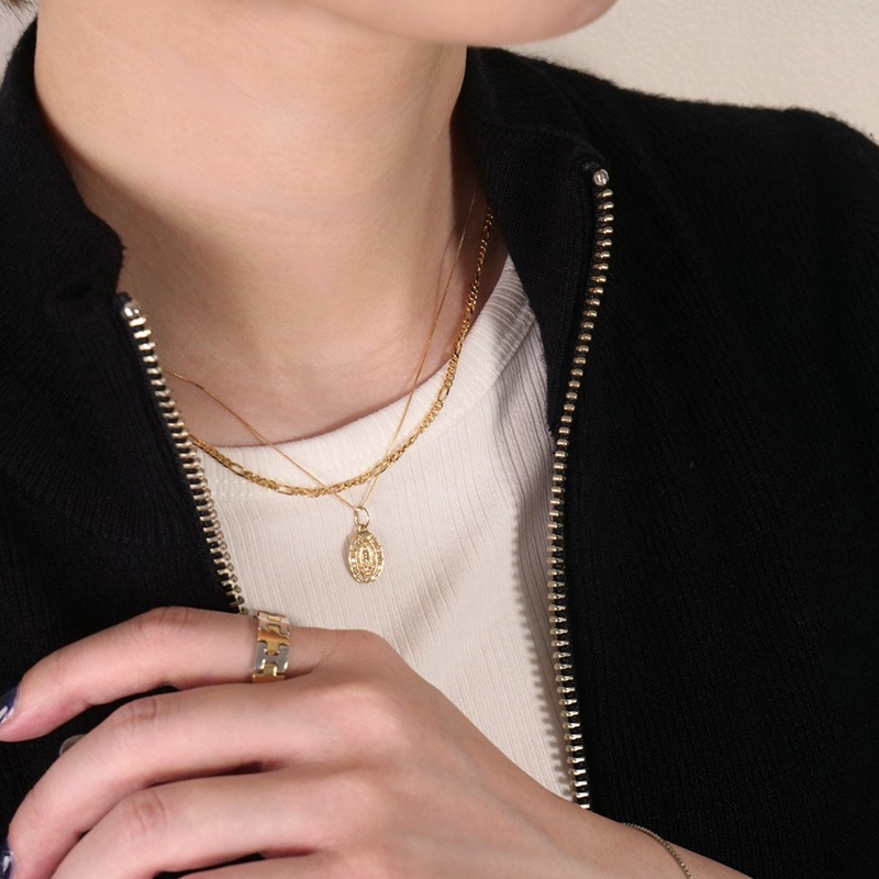 繊細なマリアメダイネックレスに、程よいボリュームのフィガロチェーンを重ねたレイヤードスタイル。マリアメダイの優しい輝きが女性らしさを引き立て、フィガロチェーンが大人の品格をプラス。リブトップスやジャケットにも映える、 毎日身につけたくなる万能コーデ。