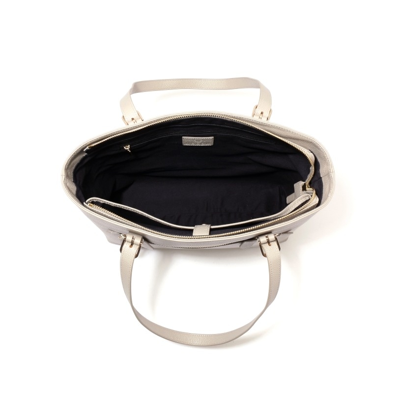 柔らかい牛本革のシボ感が優しい印象を与え、ゴールドの金具が品の良さを演出するトートバッグ。