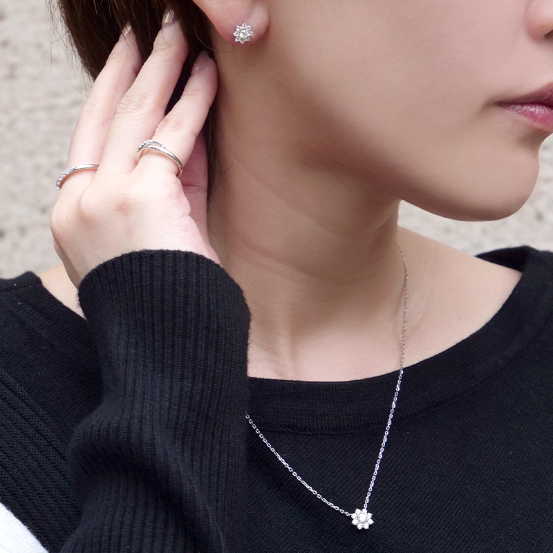 あえてシルバーとキュービックのビジューを使うことで、心ときめくジュエリーを「我慢」しすぎない価格で。