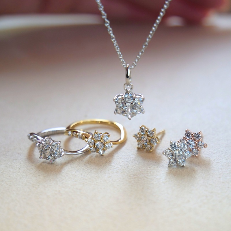 h & d Jewelryはすべてハート&キューピッドカットを施したハイグレードなキュービックジルコニアを使用し、ダイヤモンドにも引けを取らない煌めきを実現。